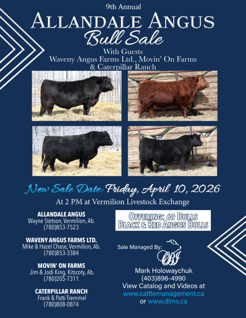 Allandale Angus Bull Sale with guests Waveny Angus, Movin On Farms, and Caterpillar Ranch.